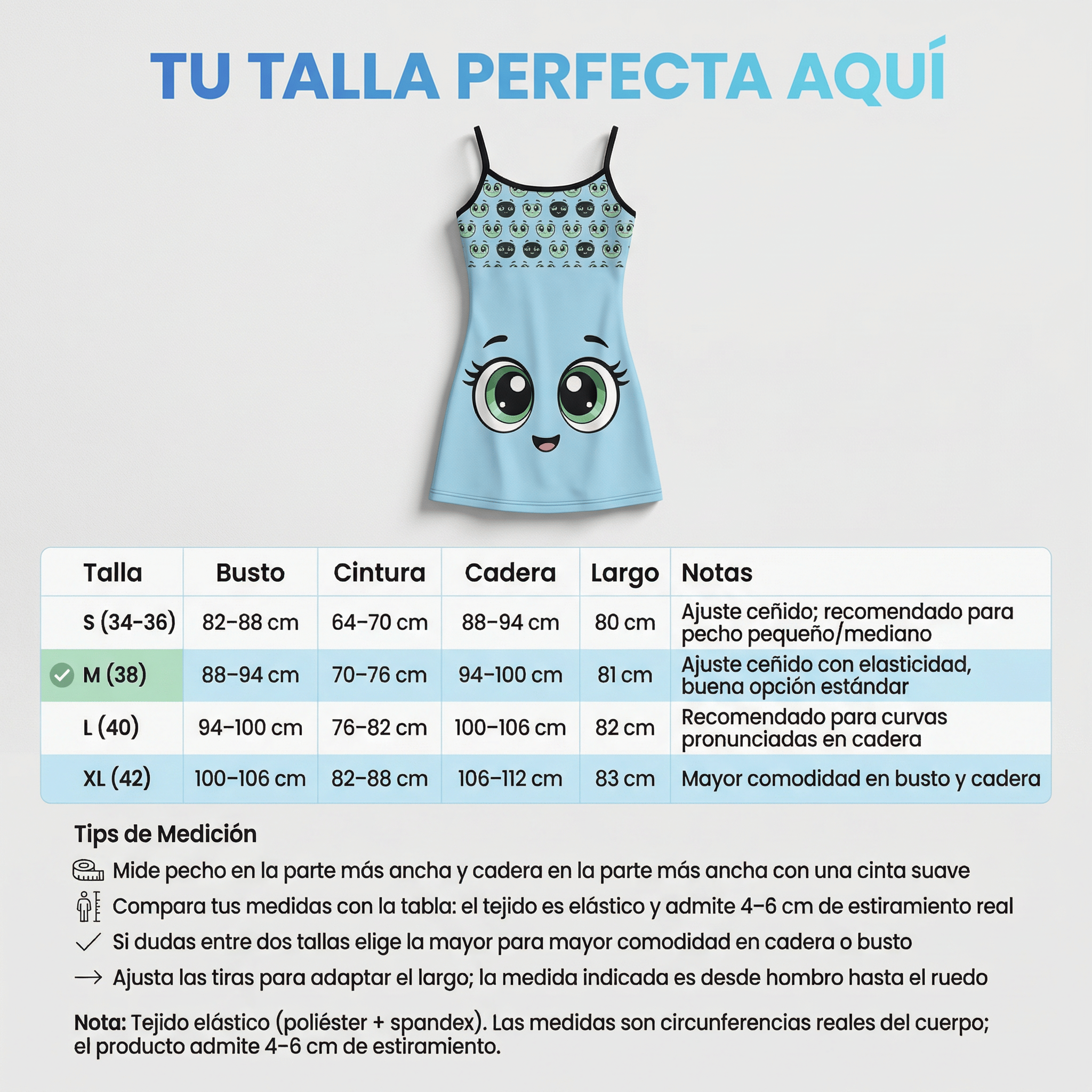 La babydoll tiene tirantes ajustables y tejido elástico que se adapta a curvas. Si dudas entre tallas, elegir la superior ofrece más libertad sin perder forma.